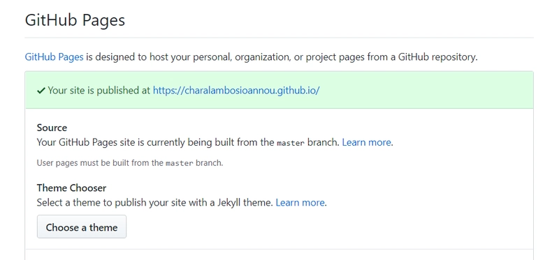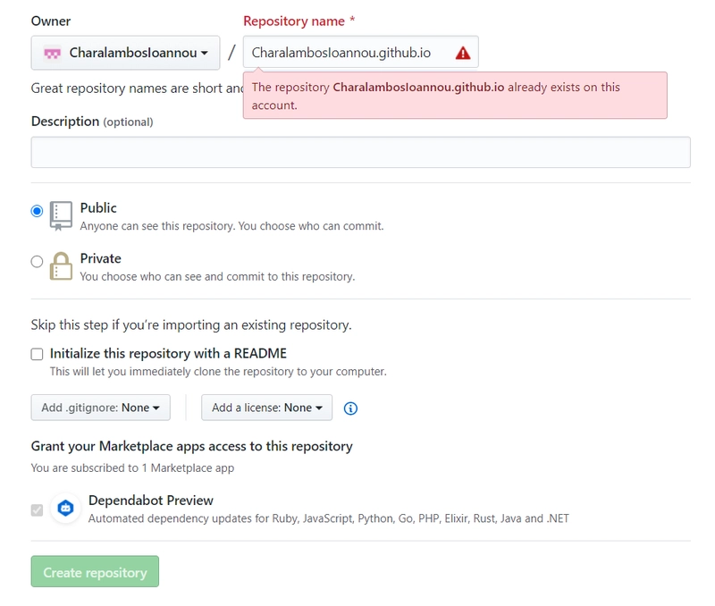 注意:我的仓库名称显示错误,因为我已经有一个名为 的仓库CharalambosIoannou.github.io。此外,该仓库必须设置为公开。