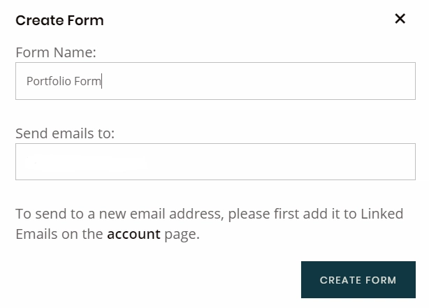 ) 点击+按钮并输入表单名称。电子邮件地址输入框将自动填充您注册 Formspree 时使用的电子邮件地址。