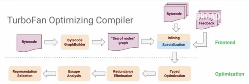 除此之外,TurboFan 明确分为 3 个独立的层:前端、优化层和后端。