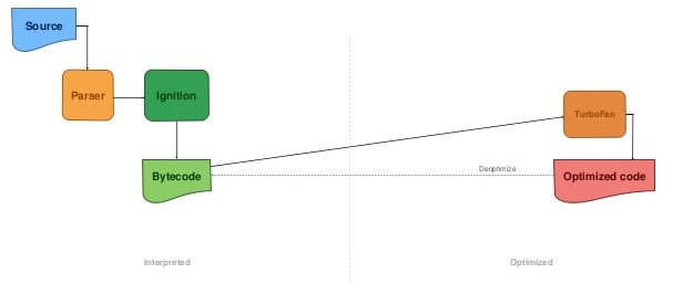 基本上,初始步骤没有改变,我们仍然需要生成 AST 并解析所有 JS 代码,但是,Full-Codegen 已被 Ignition 取代,Crankshaft 已被 TurboFan 取代。