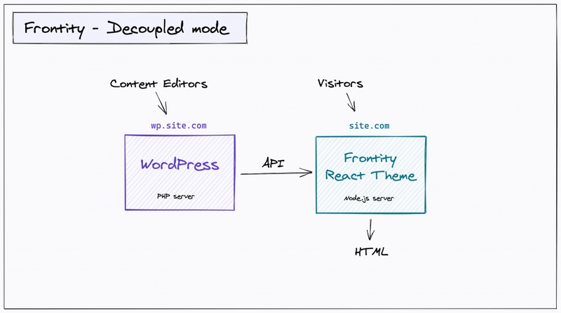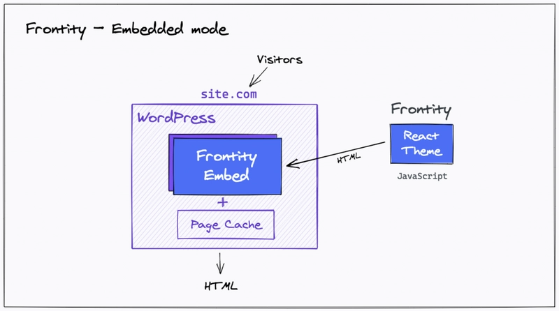 在此模式下,Frontity Embedded Mode 插件会替换 PHP 主题,并向 Frontity / Node.js 服务器发出请求,以检索 HTML 作为同构 React 应用程序,然后由 WordPress 将其返回给访问者。