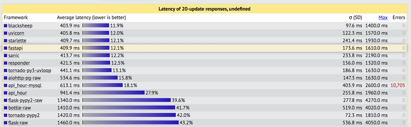 FastAPI:一个很棒的 API 创建框架,只需稍加努力就能意识到它与其他框架(如 Flask、Pyramid、bottle、tornado 和 Django)相比速度有多快。