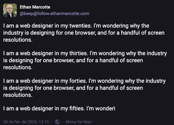 我是一名二十多岁的网页设计师。我不明白为什么整个行业只针对一种浏览器和少数几种屏幕分辨率进行设计。我是一名三十多岁的网页设计师。我不明白为什么整个行业只针对一种浏览器和少数几种屏幕分辨率进行设计。我是一名四十多岁的网页设计师。我不明白为什么整个行业只针对一种浏览器和少数几种屏幕分辨率进行设计。我是一名五十多岁的网页设计师。我不明白……