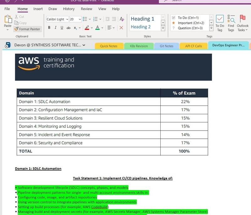 我稍后会分享我用来通过这些考试的工具,但正如你上面看到的,我第一次尝试通过了解决方案架构师专业认证考试,结果失败了。不过,AWS 的优势在于各个考试之间有很多重叠之处。例如,如果你像我一样参加了系统运维人员认证考试,虽然我前两次尝试都失败了,但之后不久我就通过了 AWS 解决方案架构师助理认证和开发人员助理认证。把这三个助理认证考试作为基础,反复练习实验,确保你掌握了蓝图上的每一个要点,因为他们会考到这些内容。我当时一边学习一边逐条标记: