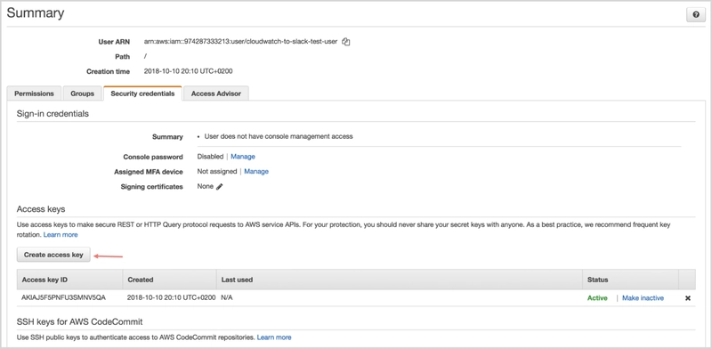 复制 AWS 访问密钥和密钥;我们将在配置 Lambda 函数部署时使用它们。