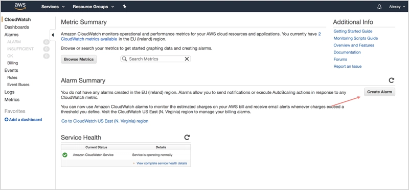通过 CloudWatch 导航至您的 AWS 账户,然后单击“创建警报”。