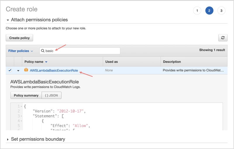 找到 AWSLambdaBasicExecutionRole 并选择它。
