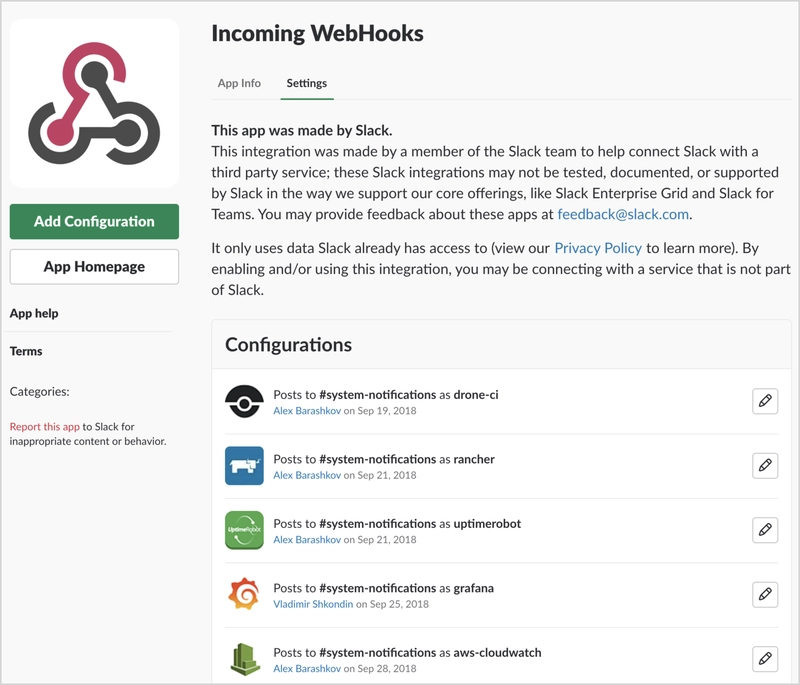 遵循每个特定服务使用一个 Webhook 的惯例。创建 Webhook 后,选择一个通道,然后发布通知,创建一个用户名(消息标题),当然,别忘了添加一张漂亮的图片。点击此处链接下载 CloudWatch 徽标。