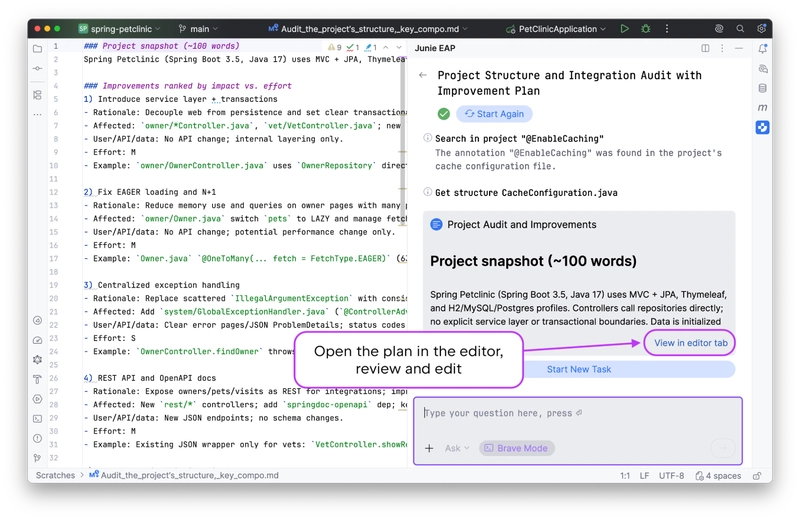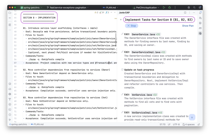 Junie 会起草一份分步骤的计划,并将其写入仓库根目录下的 PLAN.md 文件。请像对待代码一样对待该文件:提交它、审查它,如有必要,可以通过 pull request 进行讨论。公开的计划可以降低风险,因为每个人都可以看到步骤,而不仅仅是最终的差异。