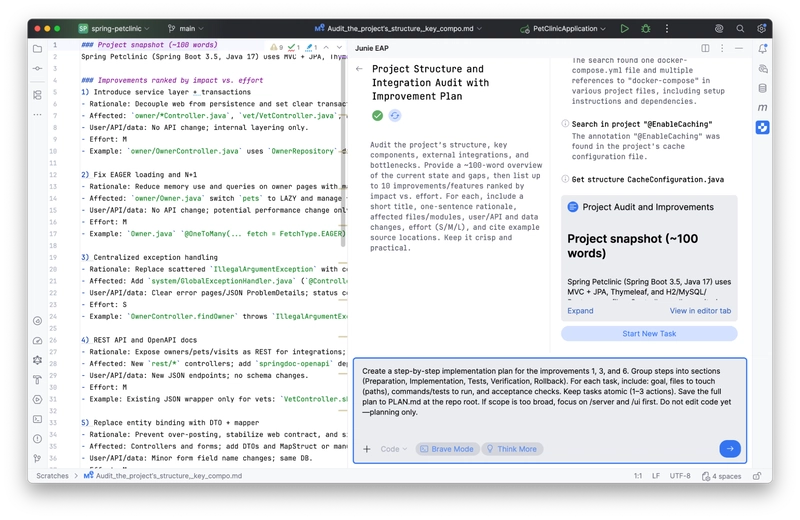 一旦任务交给 Junie,它就会扫描系统结构和集成,并识别瓶颈。然后,它会强制任务执行,根据改进措施的影响和所需投入进行排序。
