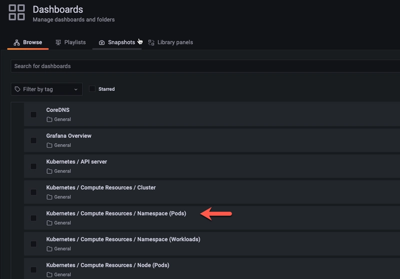 接下来,返回到上一节中打开的 Pods 控制面板,但现在将命名空间更改为default.