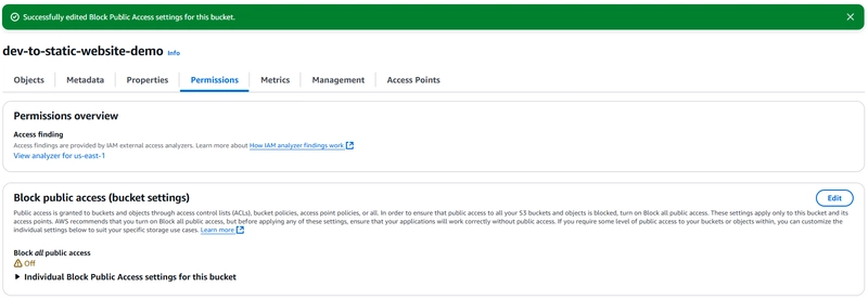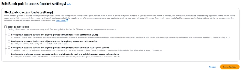 默认情况下,S3 会阻止公共访问。要允许任何人访问您的网站: