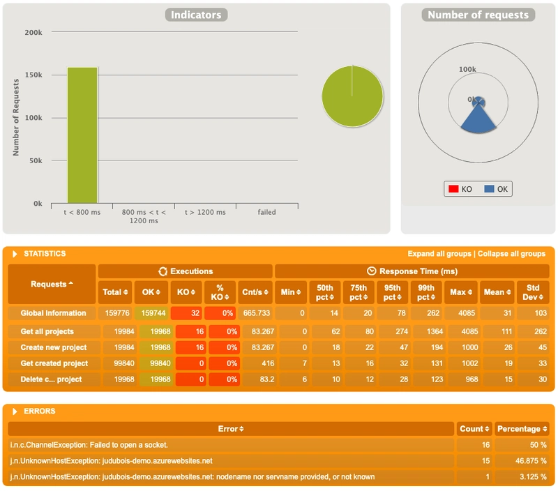 我们的测试场景是用 Gatling 构建的,可以在https://github.com/jdubois/spring-webflux-cosmosdb-sql/blob/master/src/test/gatling/user-files/simulations/ProjectGatlingTest.scala获取。这是一个简单的脚本,模拟用户使用 API 的过程:创建、查询和删除项目。