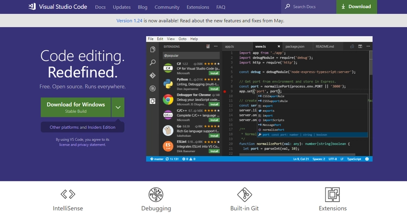 首先,我们需要一个代码编辑器或 IDE。我个人比较喜欢 Visual Studio Code(简称 VSC),因为它和 Sublime 一样轻量,但又具备一些我喜欢的 IDE 功能,尤其是 Intellisense。你可以在这里下载 Visual Studio Code ,之后会进入如下页面: 点击下载按钮,等待几秒钟即可开始下载。