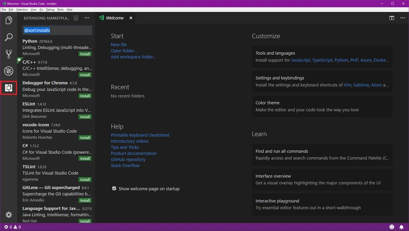 首次打开 VSC 时,您会看到一个欢迎窗口。VSC 的布局非常简单:左侧有一个包含 5 个按钮(文件资源管理器、查找、Git 集成、调试、扩展)的栏,底部有一个状态栏,以及一个包含编辑器选项卡的窗口。点击最后一个按钮即可打开扩展: