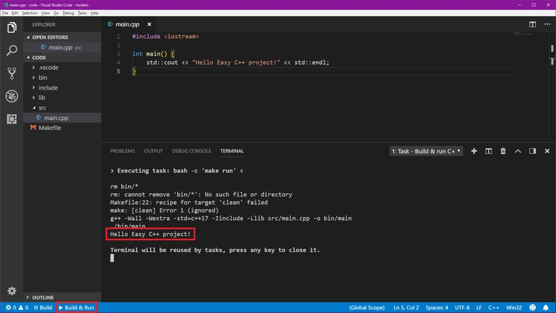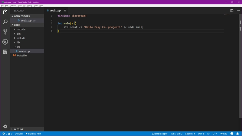 现在我们完成了创建步骤,VSC 将为我们生成项目结构,并打开main.cpp一些示例代码: