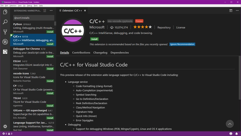 为了开发 C++,我们将安装两个扩展,第一个是 C/C++,它已经在最后一张图中显示了,要安装它只需单击绿色按钮Install: