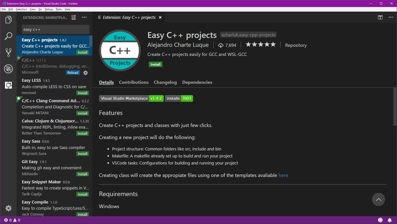 然后我们将搜索“easy c++”,然后安装名为“Easy C++ Projects”的扩展