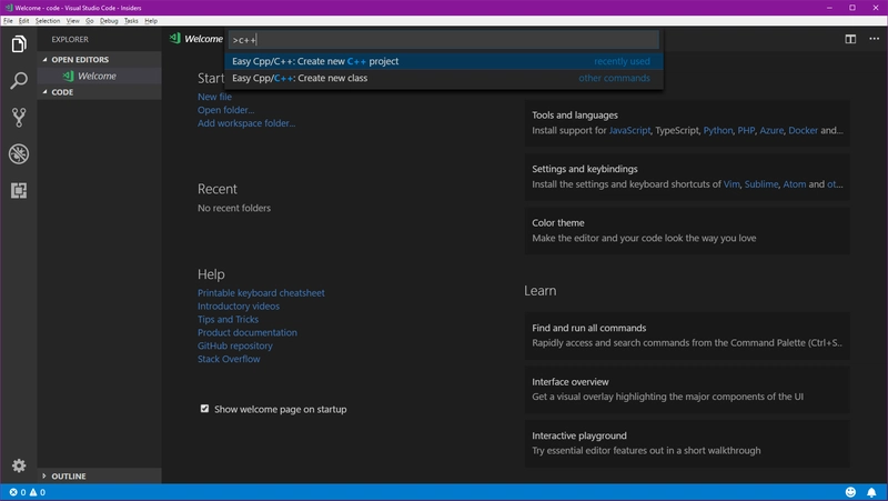 按 F1,将出现一个包含许多不同命令的小窗口,搜索“c++”并单击“创建新的 C++ 项目”: