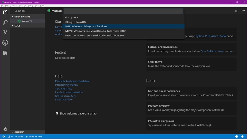 现在我们会被问到要使用哪个编译器,请查看 Easy C++ 扩展页面,了解如何为你的操作系统设置编译器。我将使用 Windows Subsystem for Linux。