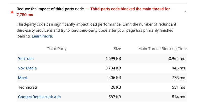 我们知道第三方脚本的成本很高。在排名前 400 万的网站中,约 2700 个源站占用了所有脚本执行时间的约 57%。Lighthouse 公开了第三方代码的影响摘要,可通过json.lighthouseResult.audits['third-party-summary']的 API 获取。