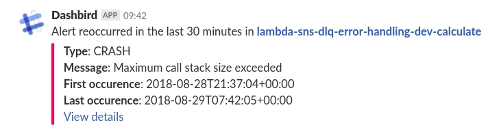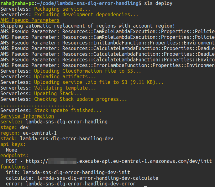 service:lambda-sns-dlq-error-handlingplugins:-serverless-pseudo-parametersprovider:name:awsruntime:nodejs8.10stage:devregion:eu-central-1memorySize:128environment:accountId:'#{AWS::AccountId}'region:'#{AWS::Region}'iamRoleStatements:-Effect:"Allow"Resource:"*"Action:-"sns:*"functions:init:handler:init.handlerevents:-http:path:initmethod:postcors:truecalculate:handler:calculate.handlerevents:-sns:calculate-topic# created immediatelyonError:arn:aws:sns:#{AWS::Region}:#{AWS::AccountId}:dlq-topicerror:handler:error.handlerevents:-sns:dlq-topic# created immediately