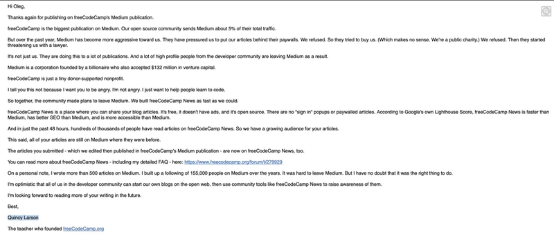 最近,FreeCodeCamp 创始人的一封电子邮件在 Twitter 上泄露。邮件中解释了 Medium 如何强行压制这家非营利组织,最终导致其退出平台。他具体写道: