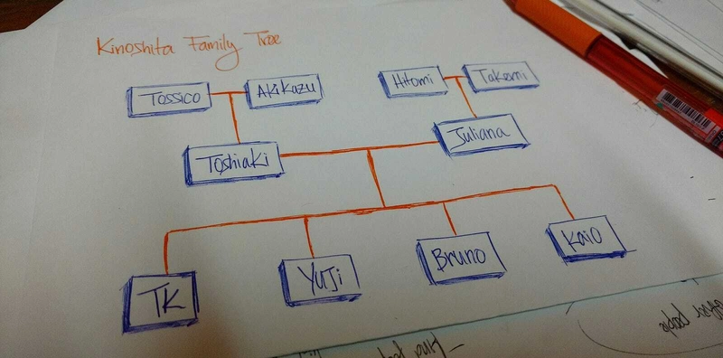 上面的图画是我的家谱。Tossico, Akikazu, Hitomi,和Takemi是我的祖父母。