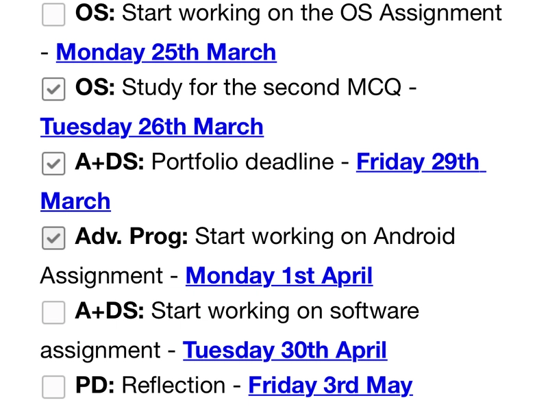 • 将所有截止日期都记录在一个地方 。我在 Evernote 里保存了一个类似这样的清单。这样我就能在一个地方看到所有截止日期,并针对每个截止日期制定学习计划——确保我尽可能均衡地完成每个截止日期/考试。