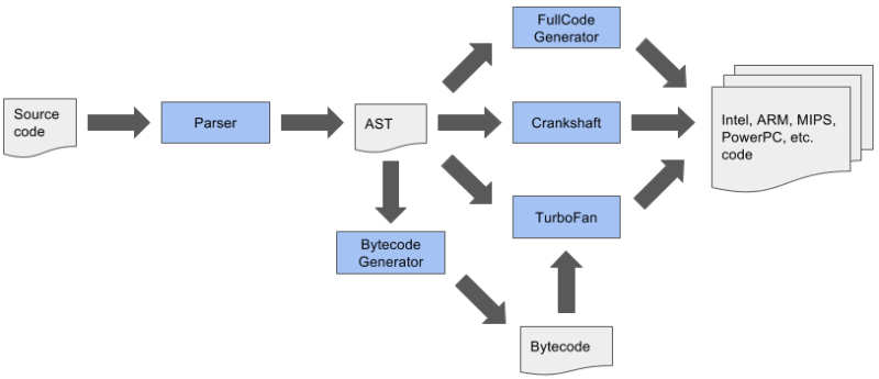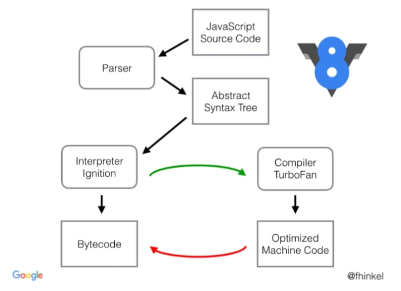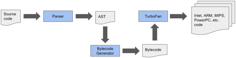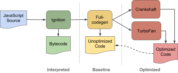 基本上,初始步骤没有改变,我们仍然需要生成 AST 并解析所有 JS 代码,但是,Full-Codegen 已被 Ignition 取代,Crankshaft 已被 TurboFan 取代。