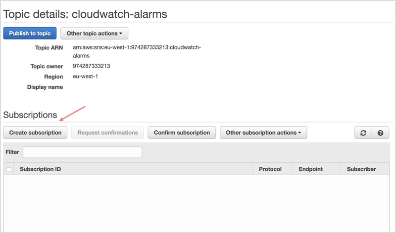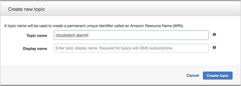 转到“主题”并单击“创建新主题”。我选择“cloudwatch-alarms”作为要发送的通知的名称。
