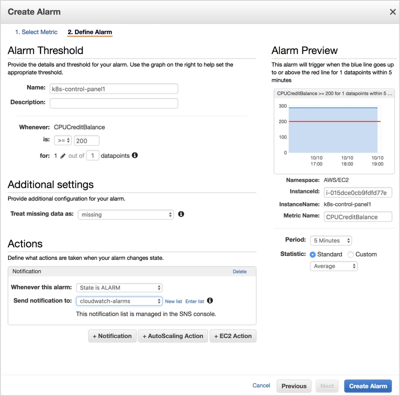 通过 CloudWatch 导航至您的 AWS 账户,然后单击“创建警报”。