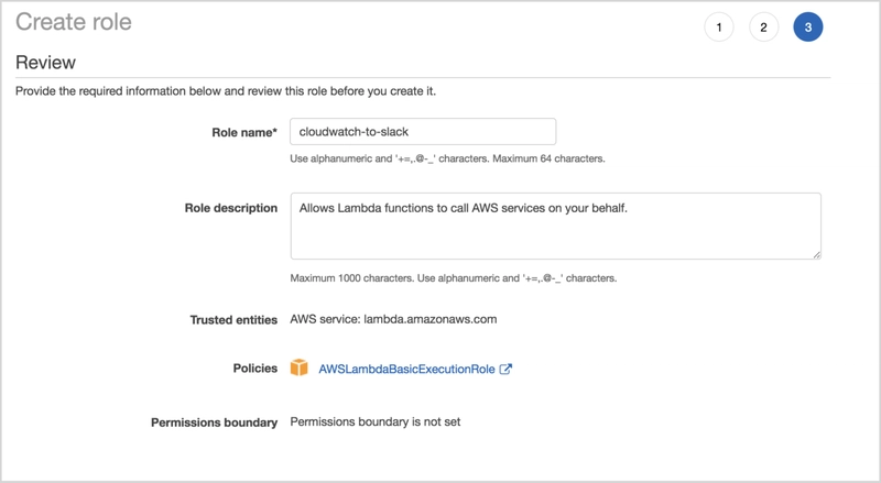 最后,输入角色名称,例如“cloudwatch-to-slack-role”,在列表中点击新创建的角色,然后复制 ARN 名称。我们将在步骤 3 部署 Lambda 函数时使用它。