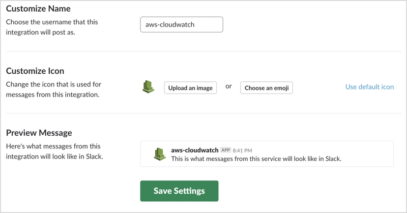 遵循每个特定服务使用一个 Webhook 的惯例。创建 Webhook 后,选择一个通道,然后发布通知,创建一个用户名(消息标题),当然,别忘了添加一张漂亮的图片。点击此处链接下载 CloudWatch 徽标。