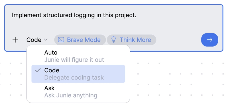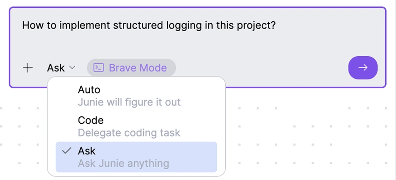 首先,您需要选择模式。“询问模式”主要用于阅读和解释,但代理程序仍可能修改文件。Junie 可以浏览您的项目、追踪依赖关系并制定计划,但它无法修改任何文件。