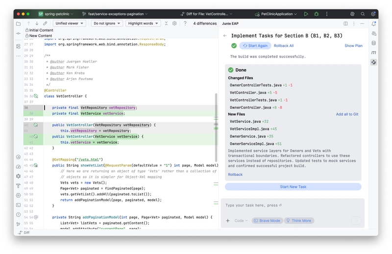 当计划看起来合理且你使用的是干净的分支时,启用代码模式。将 Junie 指向 PLAN.md 文件的第一部分,然后让它运行。你会看到执行日志,它会读取文件、提出修改建议并执行命令。你可以把它想象成受监督的自动化:Junie 负责驱动,而你则坐在副驾驶座上,随时准备踩下刹车。