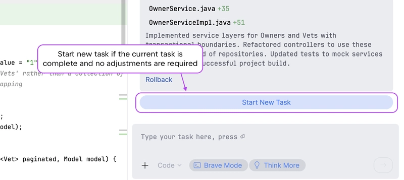 代码模式用于执行操作。Junie 会提出修改建议、运行命令并显示差异供您审核。一切尽在您的掌控之中:接受好的修改,拒绝不好的修改,然后继续前进。如果您已经制定了计划,并且希望稳步推进,设置检查点而不是出现意外情况,那么代码模式最适合您。