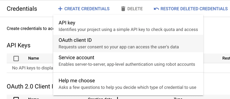 在凭据选项卡上,您可以选择“创建凭据”,然后选择“OAuth 客户端 ID”。