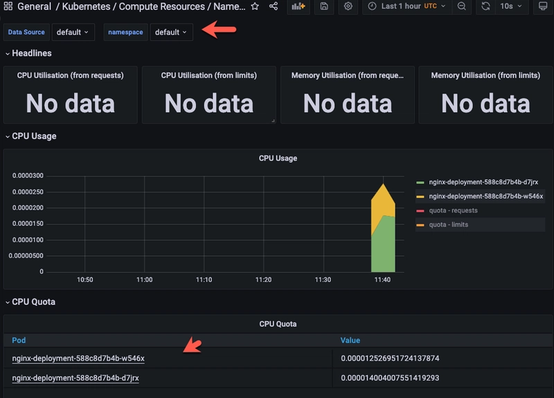 接下来,返回到上一节中打开的 Pods 控制面板,但现在将命名空间更改为default.