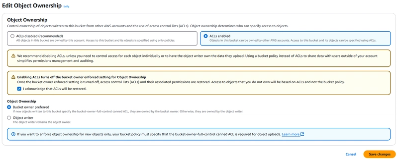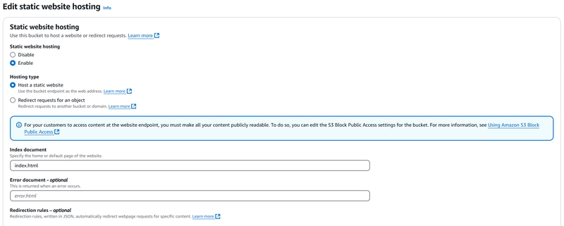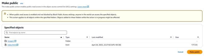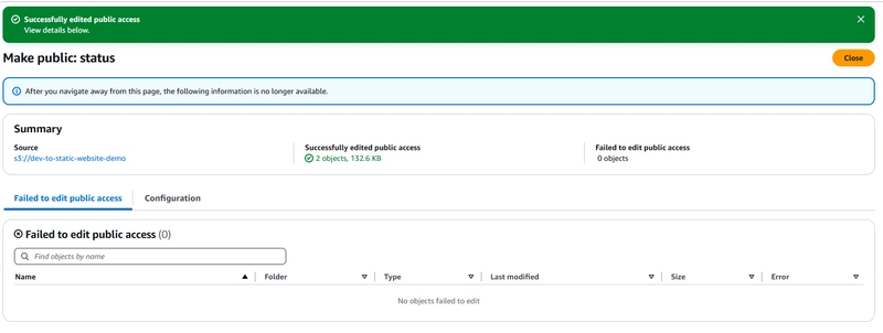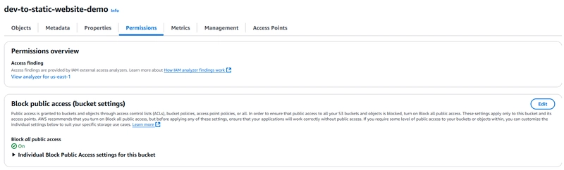 默认情况下,S3 会阻止公共访问。要允许任何人访问您的网站: