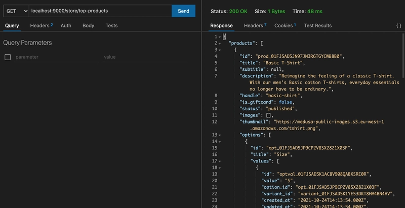 在这段代码中,您在端点添加了一个新的 GET 路由/store/top-products。之所以在这里使用 `@ storestorefront` 作为前缀,top-products是因为 Medusa 会将所有 storefront 端点都加上 `@storefront` 前缀/store,将所有 admin 端点都加上 `@admin`/admin前缀。您并非必须添加此前缀,但遵循 Medusa API 的约定是有益的。