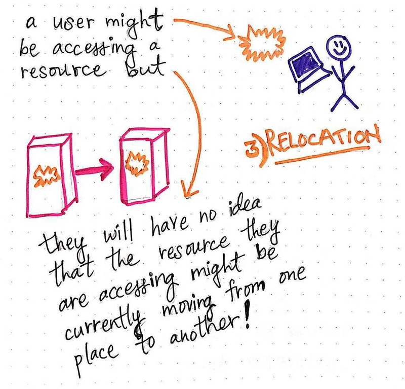 迁移透明性需要两个重要组成部分协同工作。首先,被迁移的资源必须能够被“迁移”。这可能意味着将其复制到另一个位置,也可能意味着复制资源,将其移动到其他位置,然后再从原位置移除。其次,如果资源迁移透明,则需要“隐藏”其正在迁移的事实,因为很可能有人(最终用户、程序员,甚至是分布式系统中的另一个节点!)正在访问它。
