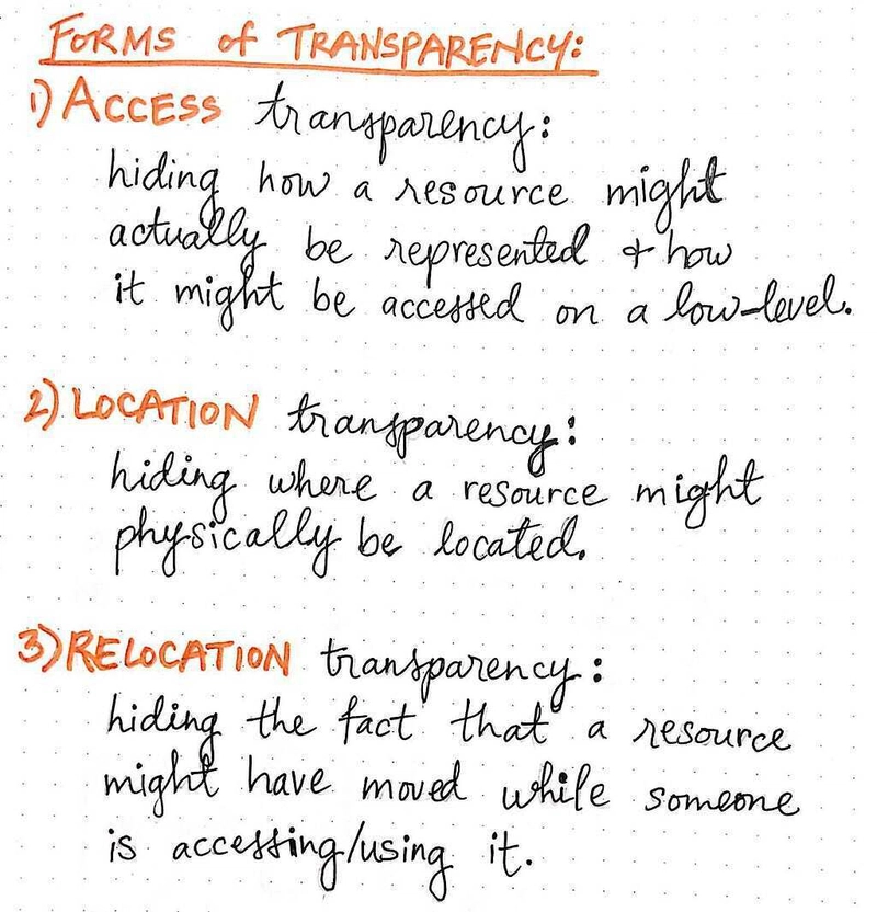 如果我们把分布式系统想象成许多分散在各处但协同工作的节点,那么我们就可以推断出,这里可能存在一些需要“隐藏”的东西。例如,透明性可以隐藏系统在多个节点上处理数据的事实,也可以隐藏数据可能存在于多个协同工作的节点上的事实。
