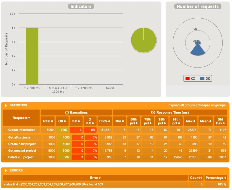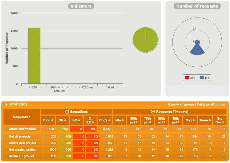 我们的第一次测试有 100 个用户,正如预期的那样,一切运行良好,因为并发请求并不多: