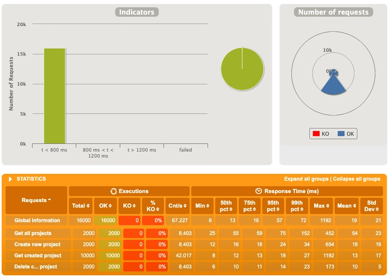 我们的测试场景是用 Gatling 构建的,可以在https://github.com/jdubois/spring-webflux-cosmosdb-sql/blob/master/src/test/gatling/user-files/simulations/ProjectGatlingTest.scala获取。这是一个简单的脚本,模拟用户使用 API 的过程:创建、查询和删除项目。