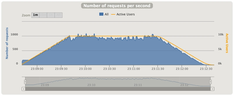 另请注意,我们的第 99 百分位性能非常出色,而且我们在一分钟内轻松扩展到每秒 10000 次请求,图表也非常清晰: