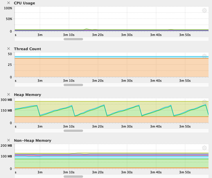 此外,我们的CPU使用率极低,线程数稳定,内存使用率也很低且稳定: