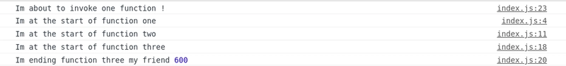 事情很简单。我们没有调用任何东西(在函数三中),所以整个过程现在结束了。在控制台中,我们得到: