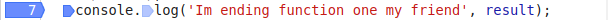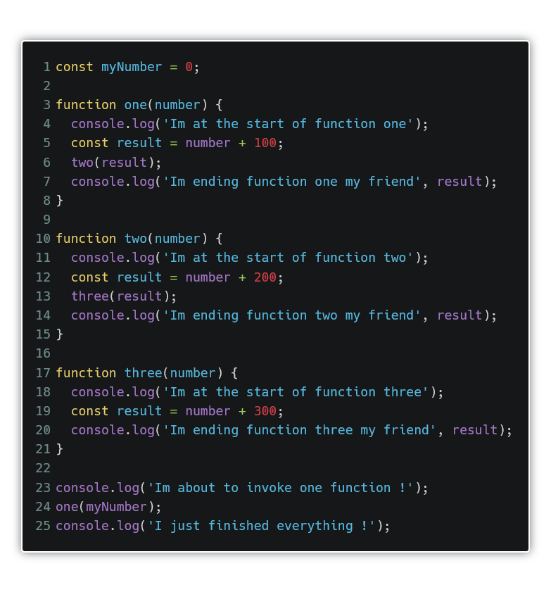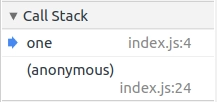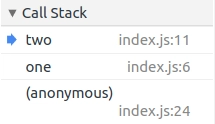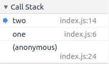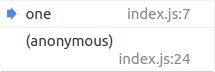 在函数 one 开头设置的断点(注意!断点在标记行之前暂停,在本例中是在 console.log 之前!)告诉我们 console.log('Im about to invoke one function!') 和 one(myNumber) 已执行。另一方面,console.log('I just finish everything!') 却没有显示,尽管它在下面一行。为什么?为什么它看起来像是在第四行?因为被调用函数的执行上下文已被压入堆栈,此后的所有内容目前对 JavaScript 引擎都无关紧要。