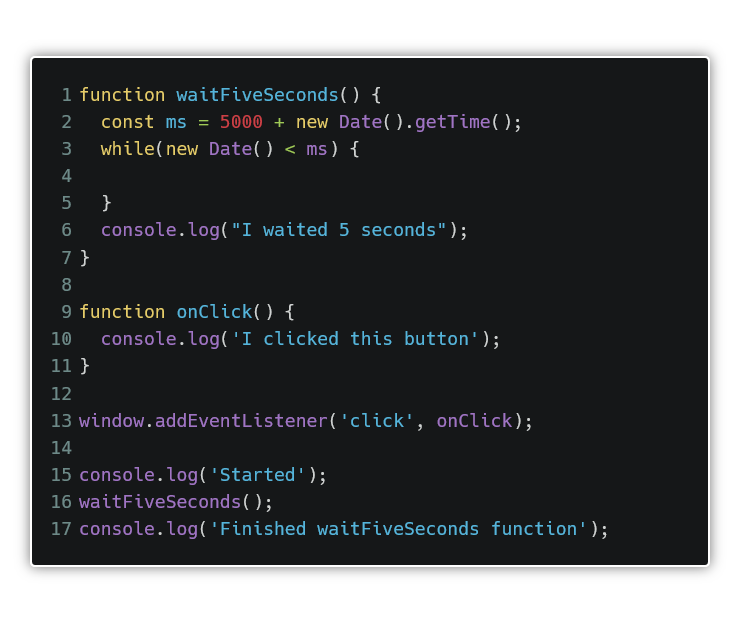 waitFiveSeconds 函数的作用正如其名——等待五秒钟。由于 JavaScript 是单线程且同步的,因此在前五秒钟内点击鼠标的次数并不重要。最终结果如下: